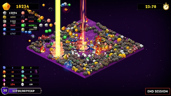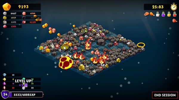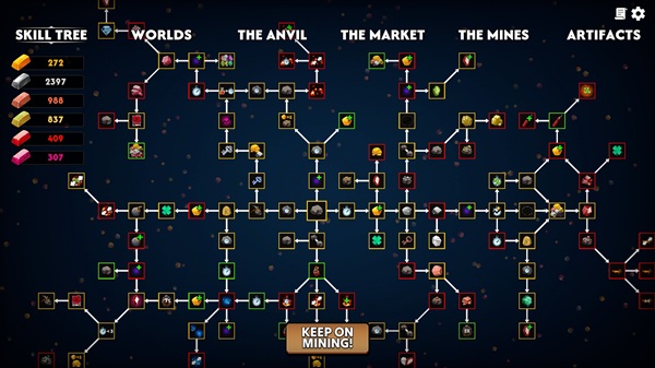 Players mine rocks to collect resources, then use those resources for upgrades, pickaxes, items, and progress. The loop is simple, but the skill tree, worlds, and talent cards add long-term goals. -