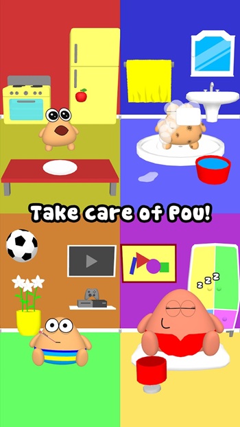 Pou 3D is a casual virtual pet game where players take care of an alien character through feeding, cleaning, rest, mini-games, and room decoration in a 3D environment. -