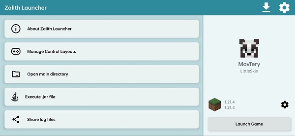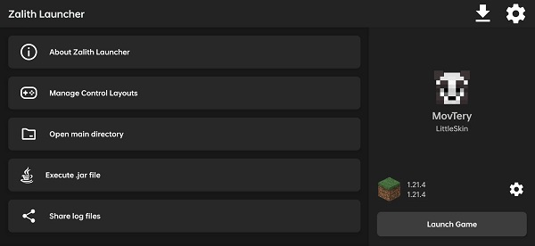 Antarmuka Zalith Launcher dirancang sederhana namun fungsional. Pengguna dapat memilih tema terang atau gelap sesuai kenyamanan, serta menyesuaikan tata letak kontrol untuk pengalaman bermain yang lebih natural. Fitur file manager internal memudahkan pemain mengelola berkas game tanpa harus keluar aplikasi, sehingga semua pengaturan bisa dilakukan di satu tempat.
